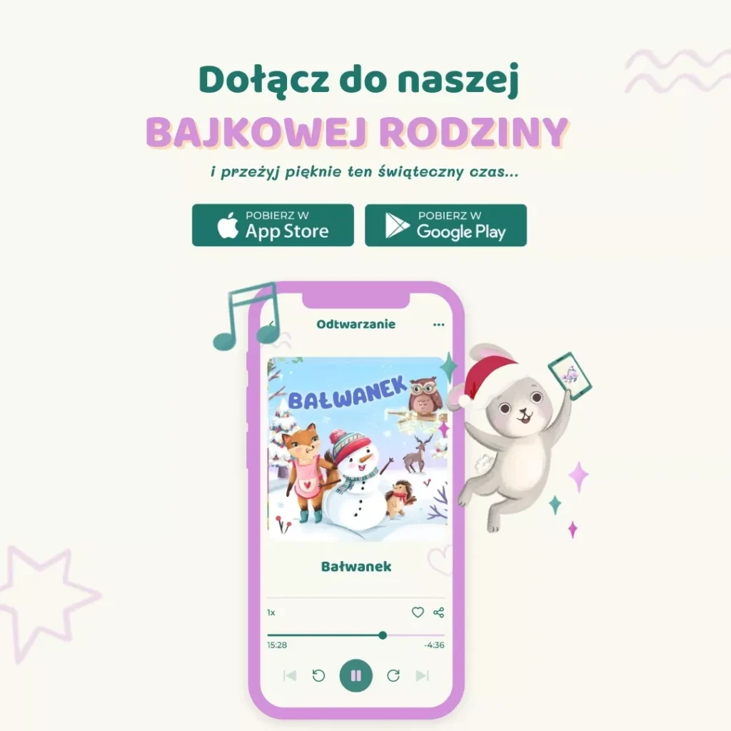 📲 Pobierz aplikację Bajkowe Poddasze w Google Play lub App Store i odkryj świat audiobajek, piosenek i kołysanek tworzonych z serca.